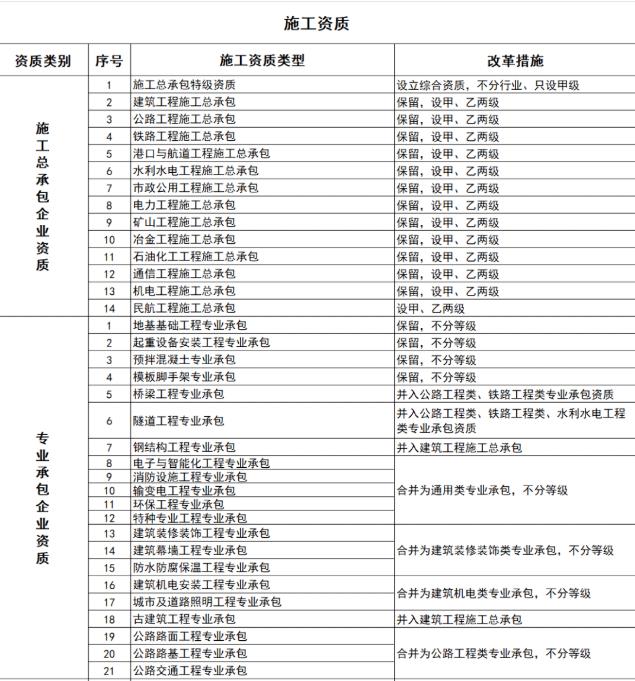 其中 施工總承包特級資質調整為施工綜合資質,施工總承包一、二、三級資質等級壓減為甲、乙兩級,甲級資質在 本類別內承攬業務規模不受限制,原一級資質調整為甲級資質,其他等級資質合并為乙級資質。
