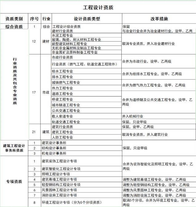 (二)工程設計資質。保留綜合資質。對部分行業資質進行整合,其中,冶金行業與建材行業合并為冶金建材行業資質,輕紡行業、農林行業、商物糧行業合并為輕紡農林商物糧行業,電子行業、通信行業、廣電行業合并為電子通信廣電行業,石油天然氣行業并入化工石化醫藥行業,軍工行業并入機械行業,核工業行業并入電力行業,資質等級壓減為甲、乙兩級,原丙級資質并入相應行業乙級資質。取消海洋行業及專業資質,相關企業可以換發相近行業資質。整合原化工石化醫藥、石油天然氣、電力、市政行業中的專業資質,資質等級壓減為甲、乙兩級,原丙級資質并入相應專業乙級資質;取消其他行業的專業資質,并入相應行業資質,原甲、乙級專業資質并入相應等級的行業資質,原丙級專業資質并入乙級行業資質。將專項資質調整為通用專業資質,取消環境工程專項資質的5個專項類別,整合為環境工程專業資質,資質等級壓減為甲、乙兩級,原丙級資質并入相應專業乙級資質。保留3類事務所資質。