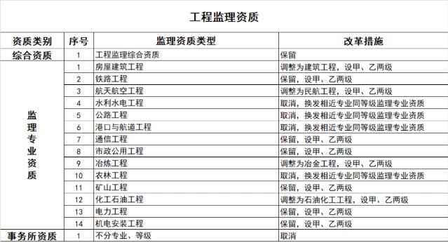 按照國務院深化“放管服”改革部署要求,大幅壓減企業資質類別和等級(改革措施詳見附件3)。 改革后,工程勘察資質分為綜合資質和專業資質,工程設計資質分為綜合資質、行業資質、專業資質和事務所資質,施工資質分為綜合資質、總承包資質、專業承包資質和專業作業資質,工程監理資質分為綜合資質和專業資質。