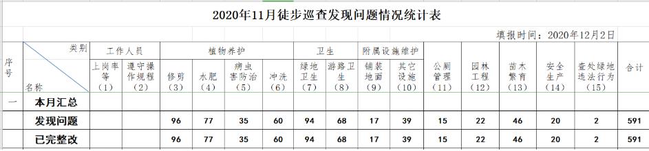 11月份局屬各綠化管養單位徒步巡查共發現問題591條,發現問題基本整改完成。通過匯總發現存在問題zui多的方面是植物修剪、綠地衛生、游路衛生,分別是96條、94條、68條。各單位要加強冬季植物修剪整形,確保植物修剪層次分明。加強綠地衛生保潔力度,及時清掃枯枝落葉,白色垃圾,確保各公園廣場、綠地環境干凈整潔。
