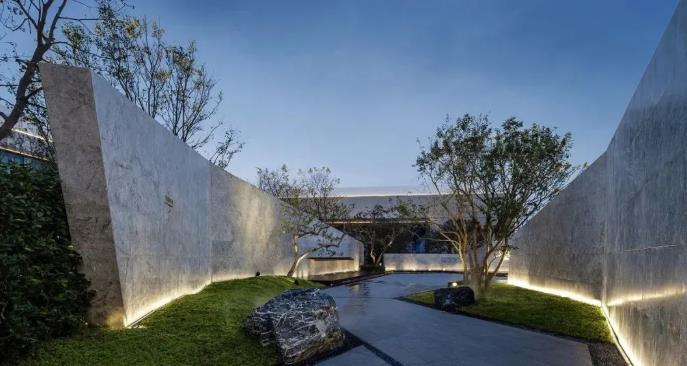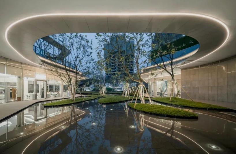 燈帶,可以隱藏的形式弱化自身存在感,沿著相應的空間輪廓漸次排布開來,凹出獨特的幾何或曲線造型。既能夠不顯得突兀雜亂,也能在夜晚時分綻放光彩,賦予景觀的第二套屬性。