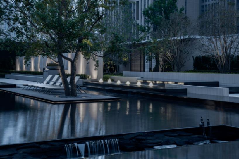 ????? 有良好的倒影效果,水面上的物體由于倒影的作用,給人以詩意、輕盈、浮游和幻想的視覺感受。風(fēng)和景明,波光沁碧。石之重疊立構(gòu),水之清澈靜美,木之溫潤拙樸,與風(fēng)、陽光相互呼應(yīng),傳遞自然的溫度。度假感的輕松氛圍在秩序與自然中悄然而生,形成寧靜超脫的場地力量。水,映射萬象,理性的線條形成空間的開合,融入留白意境,留下無限遐想。