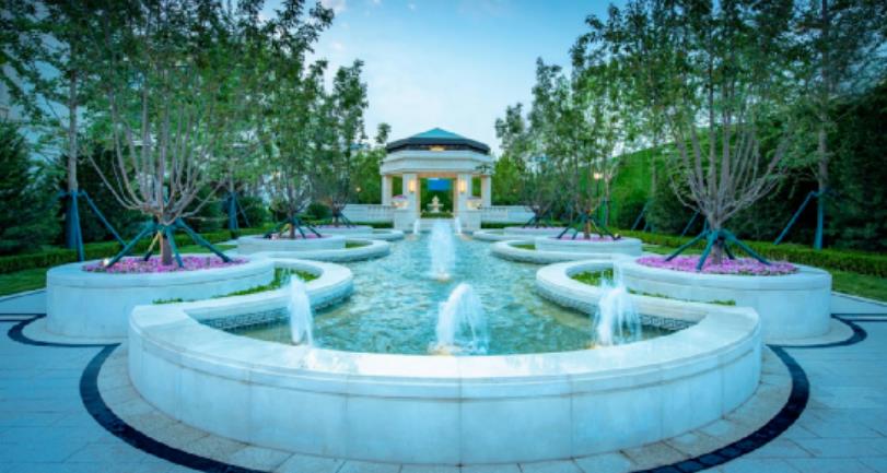 “有山皆是園,無水不成景”。中軸水景傳達(dá)出靈動韻味,噴水分層連續(xù)流出,或呈臺階狀稱為疊水.