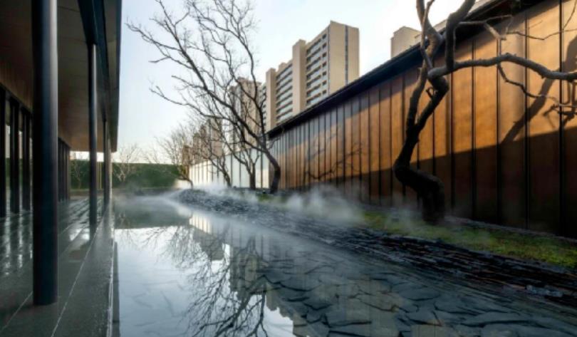 之后我們見到的又是另一種形態(tài)的水,板巖平鋪做底,出水則側(cè)鋪三角幾何微地形并種植單桿烏桕林,這便是山水林的縮影,頗有江南美景細(xì)水流長的意味,將歸家者從快節(jié)奏的都市生活中一下子拉進(jìn)江南水鄉(xiāng)的愜意中,營造出一種禪境,置身其中的人感悟有所相同又有所不同,歸于安寧。